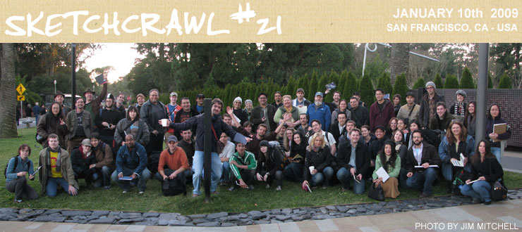 Nell’estate 2004 pensai di passare un intero sabato disegnando in giro per San Francisco. Senza fermarmi mai. Il nome sketch crawl mi venne in quell’occasione, pensando al pub crawl (crawling significa trascinarsi lentamente, ad esempio di pub in pub… fino all’ubriachezza totale)